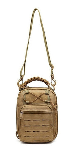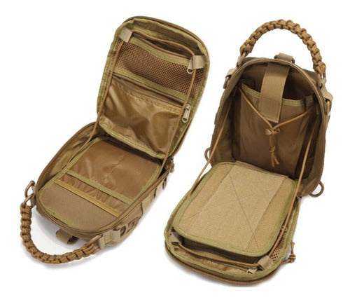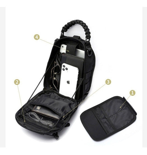 Mochila de uso lateral o a la espada con 4 compartimentos , sistema molle frontal / lateral, 2 bolsa de seguridad dentro de la mochila ,cuenta con 1 organizador .Fabricada de materiales de primera calidad nylon resistente al agua ,sistema punch frontal .